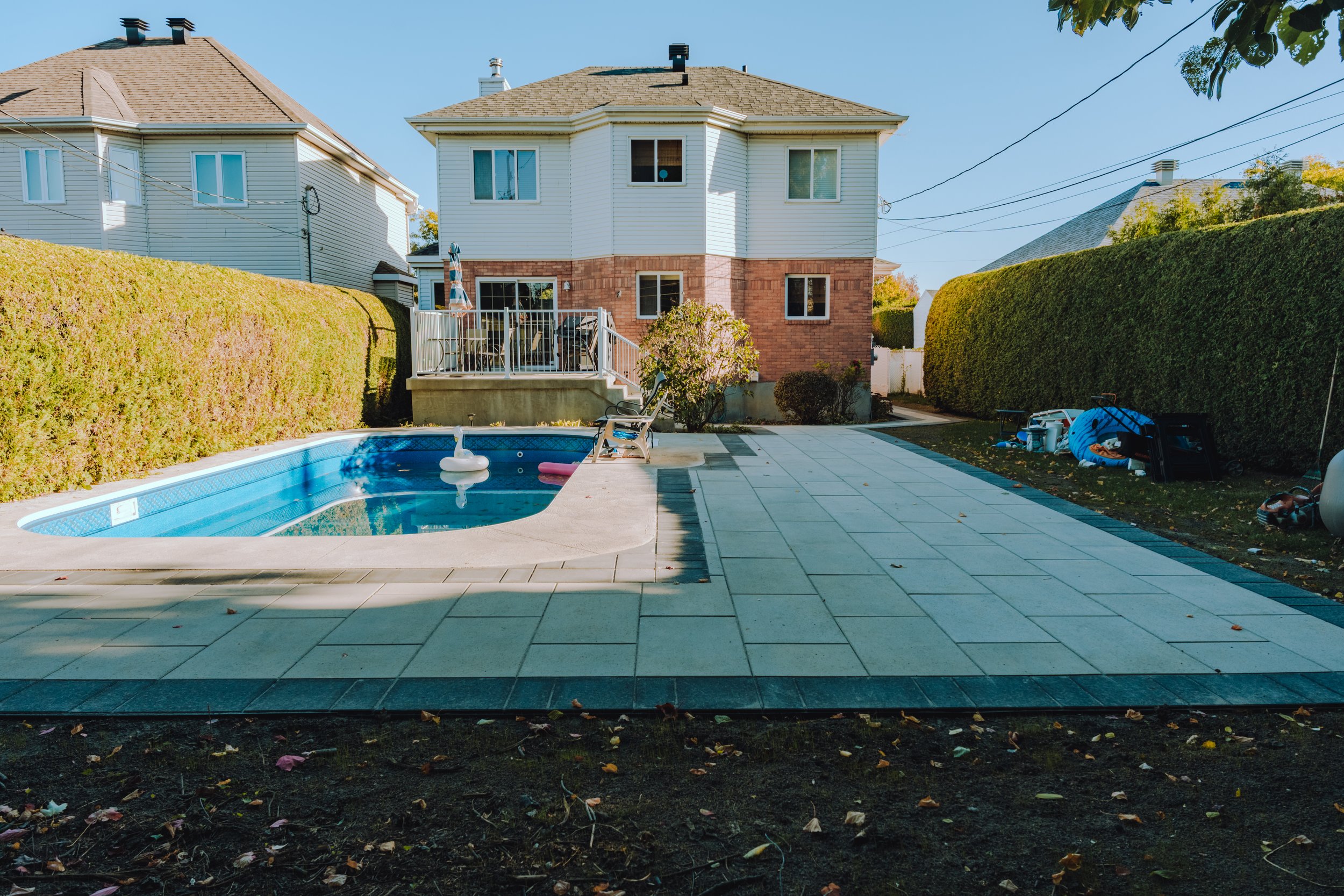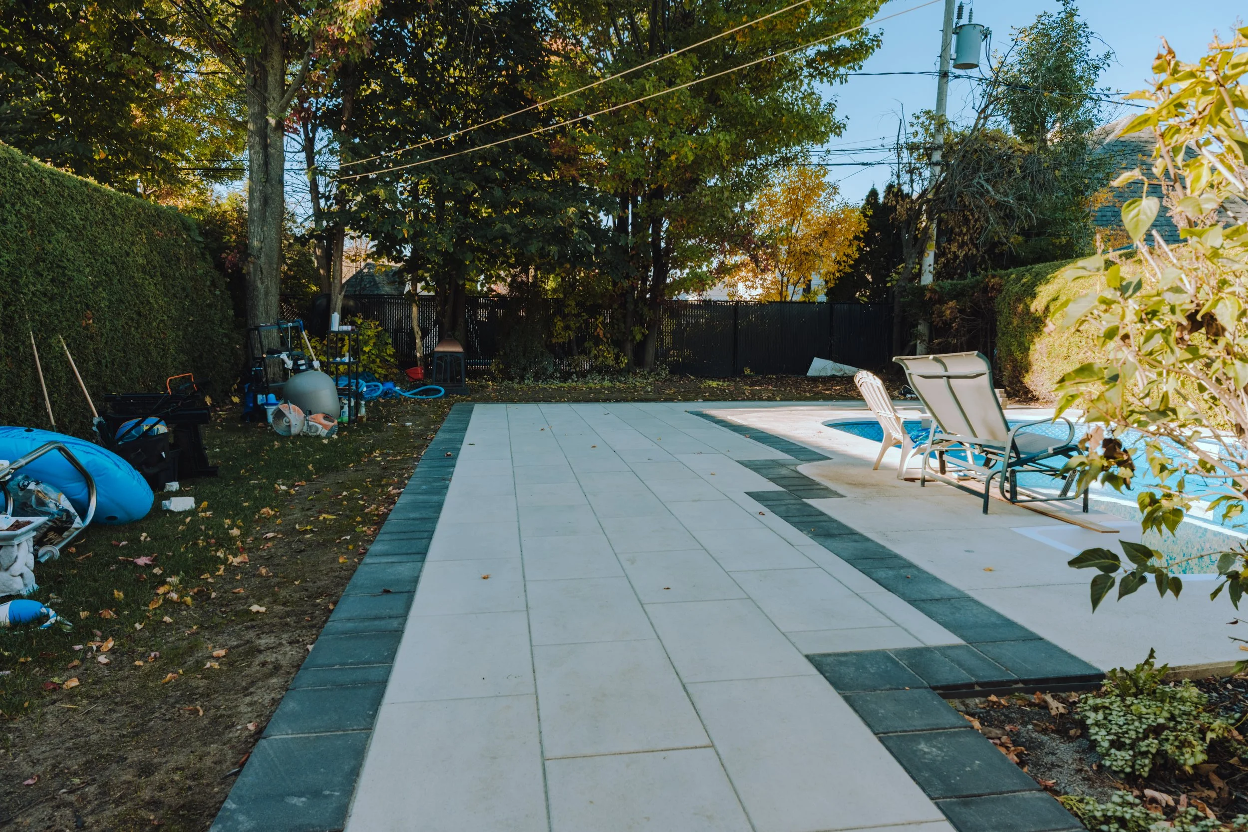 Ce projet à Repentigny a complètement transformé la cour arrière en un espace moderne et harmonieux. L’ancien pavé rose a été remplacé par un aménagement contemporain autour de la piscine creusée, utilisant de grandes dalles grises et noires qui apportent élégance et sophistication.